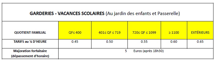 Un accueil facturé au ¼ d’heure est proposé aux familles le matin de 7h30 à 9h et le soir de 17h à 18h30. Majoration forfaitaire de 5,00 euros pour dépassement d’horaire.